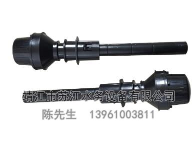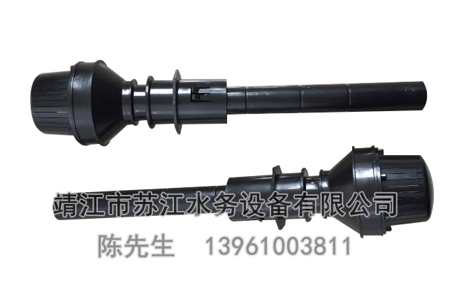 变速可调式长柄滤头包括滤头本体和预埋在滤板上的安装座。滤头本体包括滤帽体和其底端连接的滤杆,滤帽体套装在安装座上,安装座底部设有安装孔,滤杆穿过安装座的安装孔伸至滤板下侧,滤帽体与安装座螺纹连接,安装座内底部设有di一密封垫。